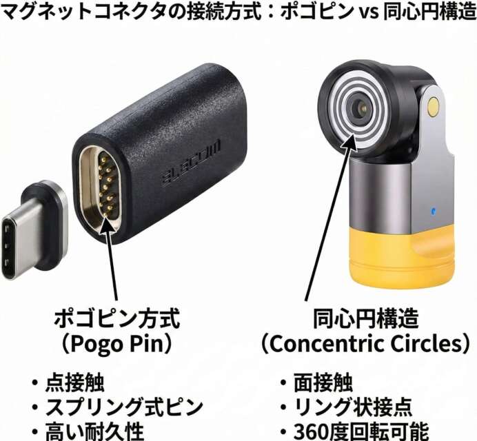 - 同心円構造: 円形タイプに多い。中心の点と周囲のリング状の面で構成されている。どの角度でくっついても、ケーブル側のピンが必ずどこかのリング(極)に接触するため、360度回転が可能。